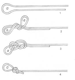 Talán a legismertebb csomózási technika. Forgókapcsok, füles horgok, egyáltalán minden kiegészítő, melynek füle van lehetőséget ad arra, hogy ezt a technikát használjuk. Strapabíró, erős kötés, gyakran alkalmazzuk.